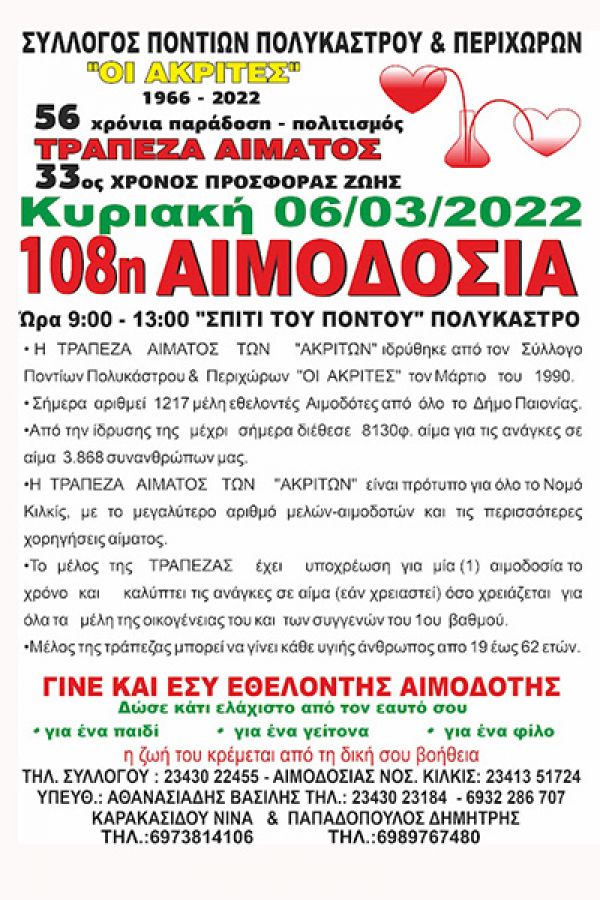 Για την αποφυγή συνωστισμού και την ομαλή διεξαγωγή της αιμοδοσίας χωρίς ταλαιπωρία και πολύωρη αναμονή παρακαλούνται τα μέλη και όσοι επιθυμούν να γίνουν μέλη και να αιμοδοτήσουν, να επικοινωνήσουν με τον υπεύθυνο συντονισμού ή τα μέλη της Διοικούσας Επιτροπής της "Τράπεζας" για τον καθορισμό του χρόνου προσέλευσης