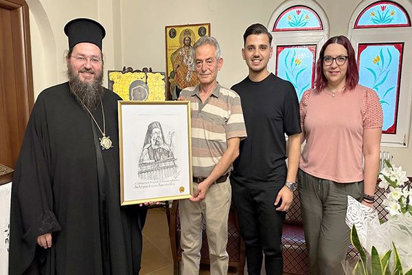 Ως ένδειξη της εκτίμησης και του σεβασμού μας, χαρίσαμε στον Σεβασμιώτατο ένα αντίγραφο σκίτσο του προσώπου του, το οποίο φιλοτεχνήθηκε και παραχωρήθηκε στην Ένωσή μας από τον κ. Αναστάσιο Αγαθαγγέλου και το οποίο αποτυπώνει την πνευματικότητα και την ηγετική του παρουσία.