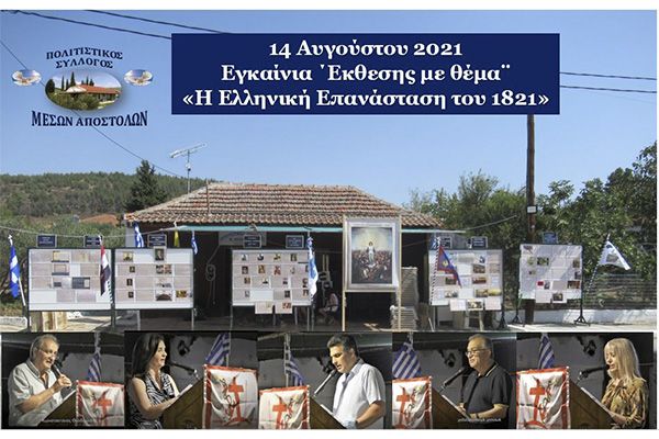 Στην αποκορύφωση των εκδηλώσεων με τα εγκαίνια της ΄Εκθεσης τη 14η Αυγούστου, πραγματοποιήθηκε ομιλία της Διευθύντριας του 1ου Γυμνασίου κ. Κωνσταντίνας Τρίγκα με θέμα: «Τα Μηνύματα του ‘21 για τον ΄Ελληνα του 2021», αφηγήσεις και απαγγελίες επίσης από τα Μέλη του Συλλόγου: Σταμπολίδη Βασίλειο με ανάγνωση αποσπασμάτων των απομνηνευμάτων του Στρατηγού Μακρυγιάννη, Ανέστη Αγαθαγγελίδη με ανάγνωση αλησμόνητων ηρωικών στιγμών της Επανάστασης και Ευγενίας Στεφανίδου με απαγγελία ποίηματος του μεγάλου μας ποιητή Γιάννη Ρίτσου με τίτλο « Ελευθερία».