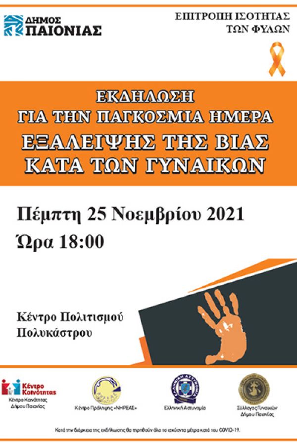 Η Επιτροπή Ισότητας των Φύλων του Δήμου Παιονίας σας προσκαλεί στην εκδήλωση που θα πραγματοποιηθεί για την Παγκόσμια Ημέρα Εξάλειψης της Βίας κατά των Γυναικών, την Πέμπτη 25 Νοεμβρίου 2021 στις 18:00 στο Κέντρο Πολιτισμού Πολυκάστρου.