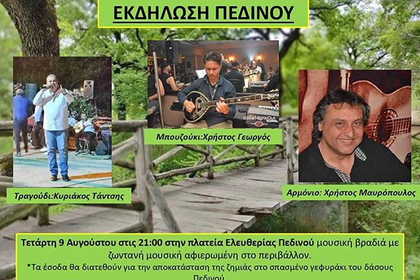 Η εκδήλωση θα πραγματοποιηθεί μέσα στα πλαίσια του προγράμματος του Εορτάζοντα Ιερού Ναού του χωριού, "Δεκαπενταύγουστος στο Πεδινό, Μυριοχαριτωμένη Βασίλισσα του κόσμου Παναγία".