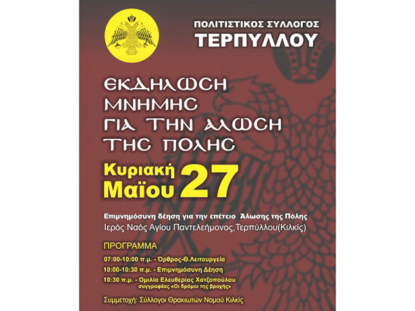 Μια ενδιαφέρουσα εκδήλωση μνήμης για την Αλωση της Πόλης οργανώνει ο Πολιτιστικός Σύλλογος Τερπύλλου το πρωί της Κυριακής 27 Μαΐου.
