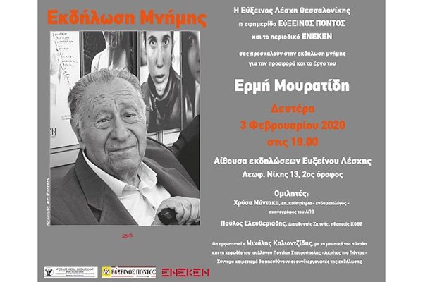 Εκδήλωση μνήμης για την προσφορά και το έργο του Ερμή Μουρατίδη, διοργανώνουν η Εύξεινος Λέσχη Θεσσαλονίκης, η εφημερίδα ΕύΞΕΙΝΟΣ ΠΟΝΤΟΣ και το περιοδικό ΕΝΕΚΕΝ, την Δευτέρα 3 Φεβρουαρίου 2020, ώρα 19.00 στην αίθουσα εκδηλώσεων της Ευξείνου Λέσχης (Λεωφ. Νίκης 13, 2ος όροφος).