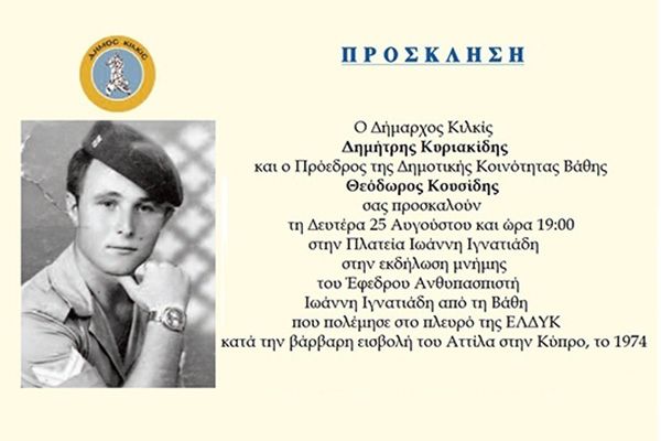 Ο Δήμος Κιλκίς και η Δημοτική Κοινότητα Βάθης αποτίουν τον οφειλόμενο φόρο τιμής στον έφεδρο ανθυπασπιστή Ιωάννη Ιγνατιάδη, τον μοναδικό Κιλκισιώτη αγνοούμενο που πολέμησε εναντίον του Αττίλα στην τριήμερη άνιση μάχη της Ελληνικής Δύναμης Κύπρου (ΕΛ.ΔΥ.Κ) τον μαύρο Αύγουστο του 1974, κατά τη δεύτερη εισβολή ισχυρών τουρκικών αρμάτων και πεζικού στη μαρτυρική Κύπρο.