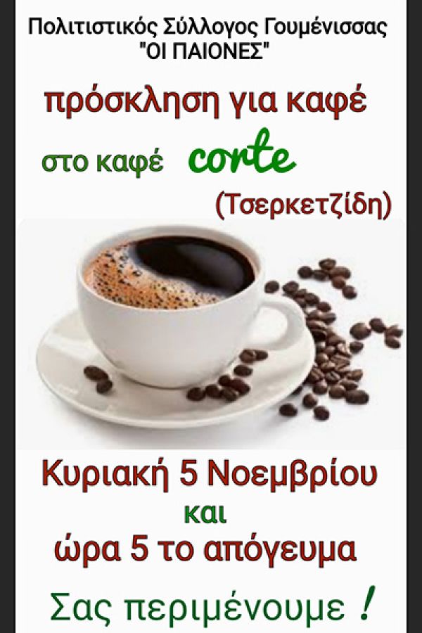 Εάν θέλετε να περάσετε ένα ευχάριστο απογευματινό, ελάτε στο καφέ που διοργανώνει ο Πολιτιστικός Σύλλογος Γουμένισσας "ΟΙ ΠΑΙΟΝΕΣ" τη Κυριακή 5 Νοεμβρίου 2023 και ώρα 5 το απόγευμα στο καφέ corte (Τσερκετζίδη) στη Γουμένισσα.