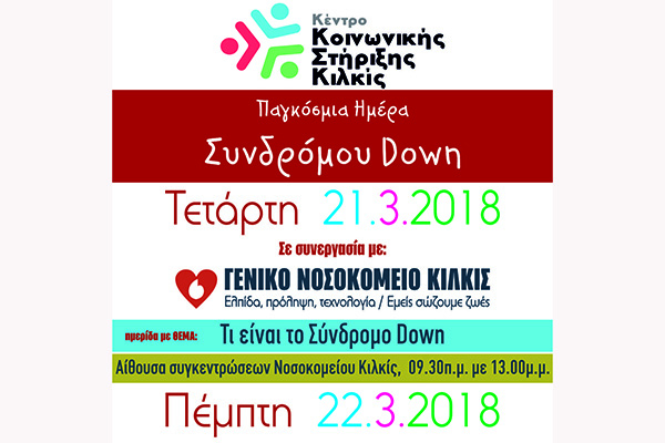 Αυτά και πολλά άλλα ερωτήματα αναμένεται να απαντηθούν στην ημερίδα που διοργανώνει το Κέντρο Κοινωνικής Στήριξης σε συνεργασία με το Γενικό Νοσοκομείο Κιλκίς, στην αίθουσα συγκεντρώσεων του Νοσοκομείου και ώρες 09.30 π.μ. με 13.00. Μια σειρά ειδικών ιατρών, θεραπευτών, επιστημόνων κλπ και από τις δύο δομές θα παρουσιάσουν το θέμα και θα ενημερώσουν το κοινό σε ότι αφορά σε αυτό το σύνδρομο ενώ θα υπάρξει και μαρτυρία μητέρας παιδιού με Σύνδρομο Down όπου θα μοιραστεί μαζί μας την εμπειρία ζωής με το παιδί της.