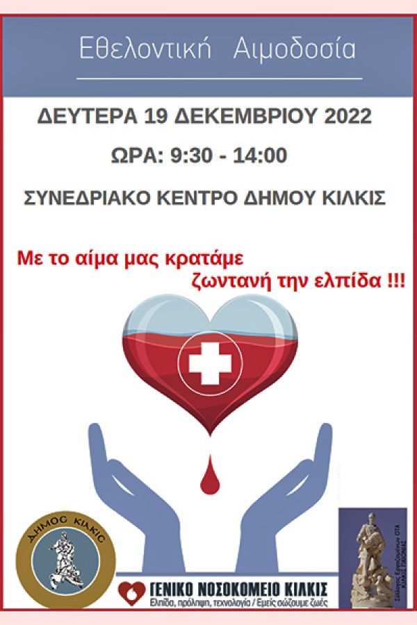 Με αυξημένο αίσθημα ευαισθησίας ο Δήμος Κιλκίς διοργανώνει εθελοντική αιμοδοσία την Δευτέρα 19 Δεκεμβρίου στο φουαγιέ του Συνεδριακού Κέντρου του Δήμου Κιλκίς από τις 9:30 έως και τις 14:00.