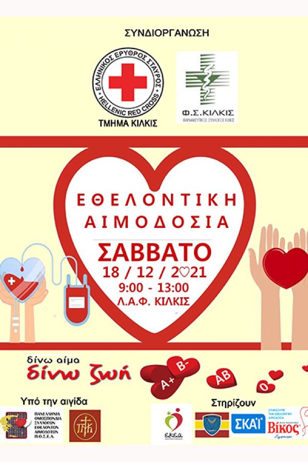 Ο Ερυθρός Σταυρός Κιλκίς σε συνδιοργάνωση με τον Φαρμακευτικό Σύλλογο Κιλκίς και υπό την αιγίδα της Ιεράς Μητροπόλεως Πολυανής και Κιλκισίου με ιδιαίτερη χαρά ανακοινώνουν την χριστουγεννιάτικη εθελοντική αιμοδοσία που θα πραγματοποιηθεί το Σάββατο 18 Δεκέμβρη 2021 και ώρα 9:00-13:00 στη ΛΑΦ Κιλκίς.