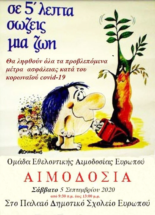 Η αιμοδοσία θα γίνει με όλα τα προβλεπόμενα μέτρα ασφαλείας κατά του κορονοϊού, στο παλιό δημοτικό σχολείο Ευρωπού, από τις 9:30 το πρωί έως τις 1 το μεσημέρι.