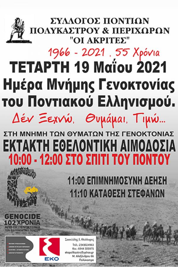 13η 'έκτακτη εθελοντική αιμοδοσία της "τράπεζας αίματος" των "Ακριτών" Πολυκάστρου την Τετάρτη 19 Μαΐου 2021 , απο τις 10:00 έως 12:00, στο "Σπίτι του Πόντου" στο Πολύκαστρο.