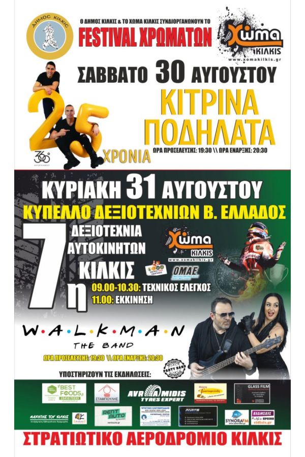 Οι πολιτιστικές και αθλητικές εκδηλώσεις του Φεστιβάλ Χρωμάτων θα πραγματοποιηθούν το Σάββατο 30 και την Κυριακή 31 Αυγούστου στο Στρατιωτικό Αεροδρόμιο Κιλκίς με συναυλίες από τα ‘’Κίτρινα Ποδήλατα’’, που συμπληρώνουν φέτος τα είκοσι πέντε χρόνια τους στην ελληνική μουσική σκηνή, τους Walk man the band και με την 7η Δεξιοτεχνία Αυτοκινήτων Κιλκίς.