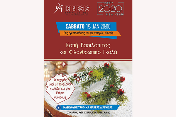 Όπως κάθε χρόνο έτσι και φέτος για όγδοη συνεχή χρονιά, στις εγκαταστάσεις του γυμναστηρίου μας, Kinesis-Gym θα πραγματοποιηθεί η καθιερωμένη κοπή της βασιλόπιτας. Σας προσκαλούμε όλους μέλη και μη του γυμναστηρίου να παρευρεθείτε σε αυτήν την γιορτή που θα έχει και φιλανθρωπικό χαρακτήρα.