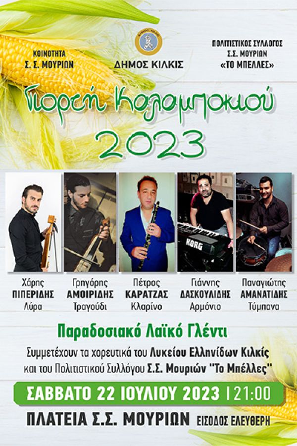 Ο Δήμος Κιλκίς, η Κοινότητα Σ.Σ. Μουριών και ο Πολιτιστικός Σύλλογος ‘’Μπέλλες’’ διοργανώνουν τη Γιορτή Καλαμποκιού, το ερχόμενο Σάββατο 22 Ιουλίου και ώρα 21:00, στην κεντρική πλατεία του Σιδηροδρομικού Σταθμού Μουριών.