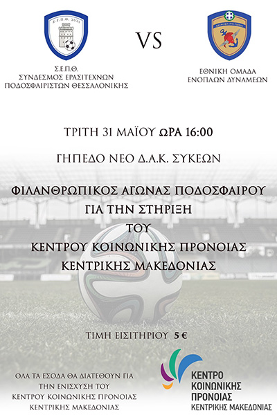 Τα έσοδα του αγώνα θα διατεθούν για την ενίσχυση του Κέντρου Κοινωνικής Πρόνοιας Κεντρικής Μακεδονίας (Κ.Κ.Π.Π.Κ.Μ.)