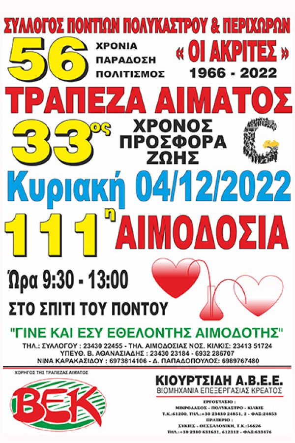 • Η ΤΡΑΠΕΖΑ ΑΙΜΑΤΟΣ ΤΩΝ "ΑΚΡΙΤΩΝ" ιδρύθηκε από τον Σύλλογο Ποντίων Πολυκάστρου & Περιχώρων "ΟΙ ΑΚΡΙΤΕΣ" τον Μάρτιο του 1990.