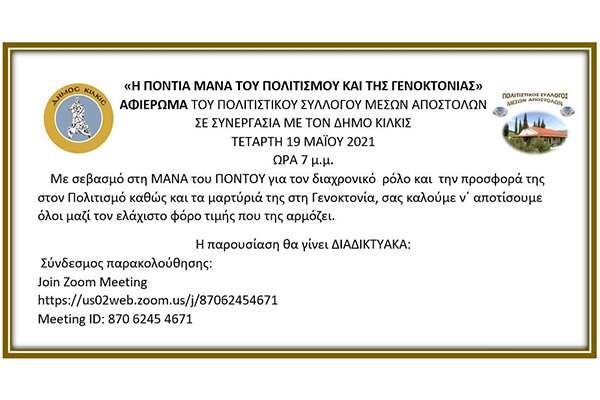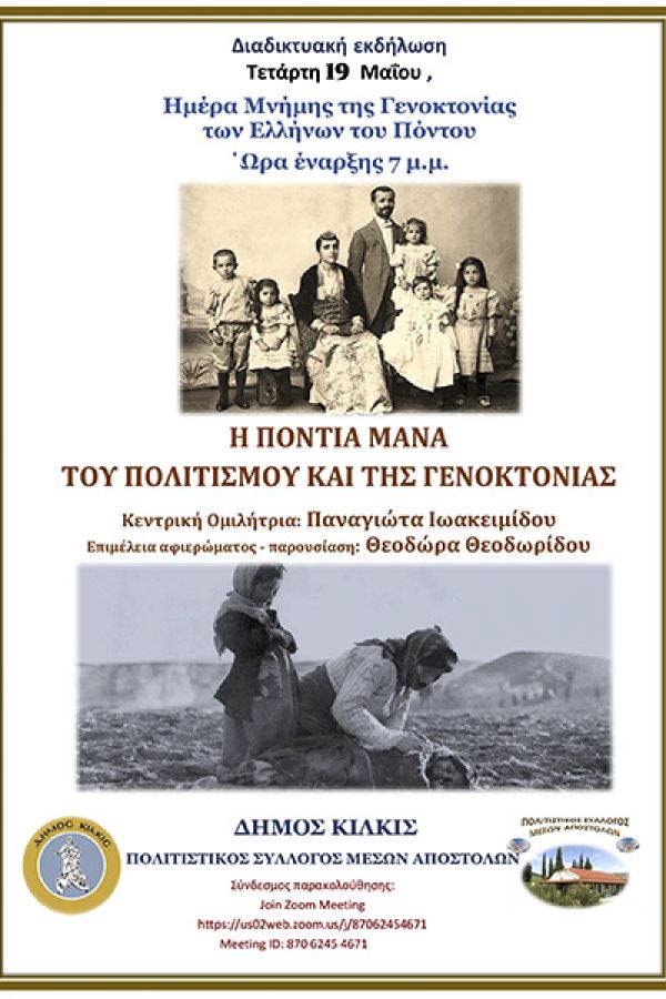 Με σεβασμό στη ΜΑΝΑ του ΠΟΝΤΟΥ για τον διαχρονικό ρόλο και την προσφορά της στον Πολιτισμό καθώς και τα μαρτύριά της στη Γενοκτονία, σας καλούμε ν΄ αποτίσουμε όλοι μαζί τον ελάχιστο φόρο τιμής που της αρμόζει.