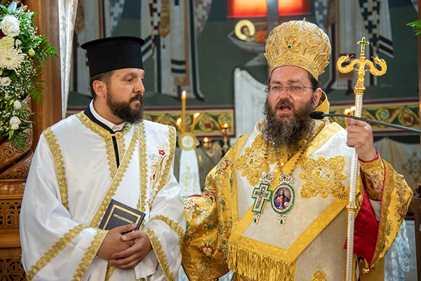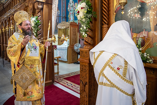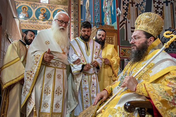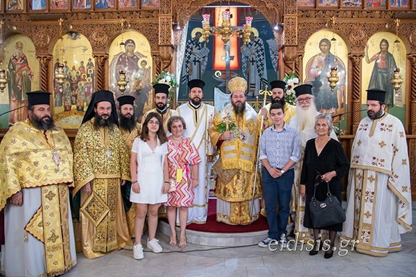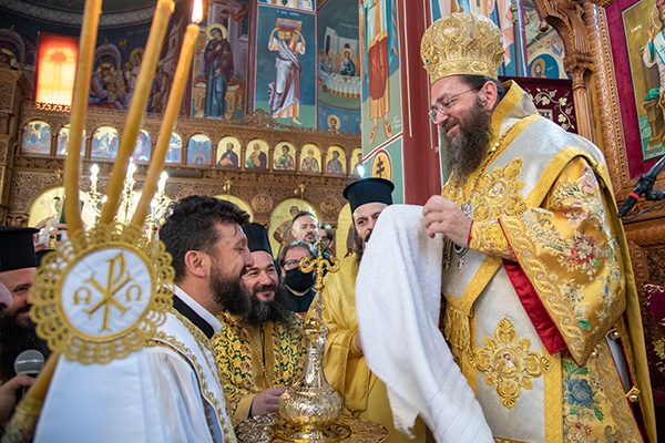 Ο Σεβασμιώτατος χοροστάτησε του Όρθρου και προέστη της Θείας Λειτουργίας, πλαισιούμενος από τον Πρωτοσυγκελλεύοντα της Ι. Μητροπόλεως Παν. Αρχιμ. π. Επιφάνιο Θεοδωρίδη, τον Πρωτ. π. Χρήστο Μήτσιο εκ της Ιεράς Μητροπόλεως Ιερισσού, πνευματικό τέκνο του οποίου είναι ο νεοχειροτονηθείς, τον Εφημέριο του Ναού Πρωτ. π. Πολύκαρπο Κοντοζίδη, τον π. Ευάγγελο Παπαδόπουλο, καθώς και από τους Ιεροδιακόνους του.