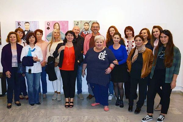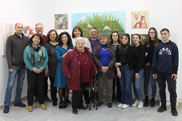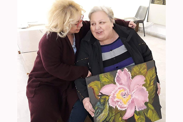 Μια εβδομάδα μετά, ήρθε στην Τέχνη, με τον πίνακα έτοιμο, τα μεγάλα χρωματιστά λουλούδια της, και με λαχτάρα να διαβάσει στα μάτια την αποδοχή. Έμεινα άφωνη από την μεγαλοσύνη, την τρυφερότητα και την δοτικότητα της και της ζήτησα να τη φωτογραφίσω με το έργο της. Σχεδόν ντροπαλά, πόζαρε καλώντας με δίπλα της. Κρα-τούσε τον πίνακα με συνεσταλμένη περηφάνεια και έναν αθώο παιδικό ενθουσιασμό.