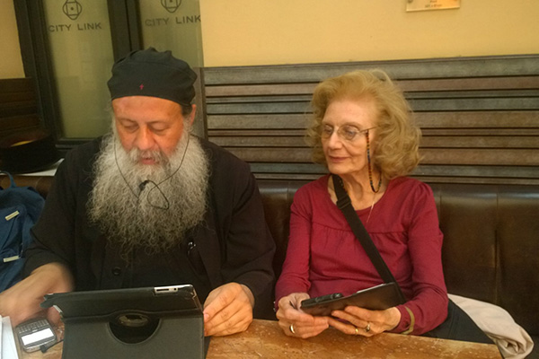 Στην πρώτη φωτογραφία ο πατέρας Χριστόδουλος με την κ. Ελένη Γεωργίου Αθανασιάδη, την ιδιοκτήτρια του Βιομηχανικού Συγκροτήματος "ΧΡΥΣΑΛΛΙΔΟΣ", σε συνάντησή τους στην Αθήνα, με αντικείμενο την επανάχρηση και την παράδοση του Μεταξουργείου στις επόμενες γενεές.
