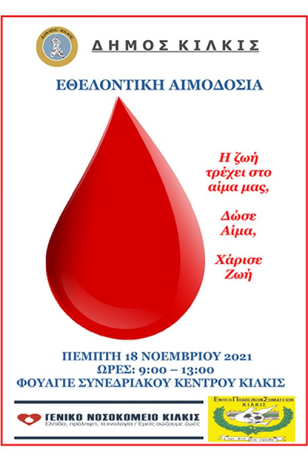 Με το κοινωνικό μήνυμα ‘’Η ζωή τρέχει στο αίμα μας, Δώσε αίμα, Χάρισε ζωή’’ ο Δήμος Κιλκίς προσκαλεί τους πολίτες σε αιμοδοσία που θα πραγματοποιηθεί την Πέμπτη 18 Νοεμβρίου, από τις 9:00 έως τις 13:00, στο φουαγιέ του Συνεδριακού Κέντρου Κιλκίς.