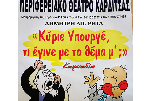 Το Περιφερειακό Θέατρο Καρδίτσας ανεβάζει τη σπαρταριστή και επίκαιρη κωμωδία του ‘’Κύριε Υπουργέ τι έγινε με το θέμα μ΄ ; ‘’που έγραψε και σκηνοθετεί ο Δημήτρης Ρήτας.