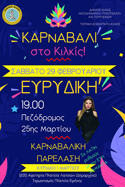 Απόκριες στο Δήμο Κιλκίς σημαίνουν Θέατρο, Μπλόκο Μασκαράδων, Κυνήγι του Χαμένου Θησαυρού, Face Painting σε αφθονία γιατί έτσι απαιτούν οι περιστάσεις, Παρέλαση Καρναβαλιστών και πολλή πολλή μουσική με Ευρυδίκη και Εύη Σιαμαντά!