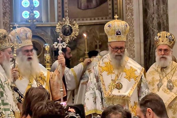 Συμπροσευχόμενοι οι Σεβασμιώτατοι Μητροπολίτες Δωδώνης κ. Χρυσόστομος, Σύρου κ. Δωρόθεος, Χαλκίδος κ. Χρυσόστομος, Μεσογαίας και Λαυρεωτικής κ. Νικόλαος, Αλεξανδρουπόλεως κ. Άνθιμος, Λαρίσης και Τυρνάβου κ. Ιερώνυμος, Περιστερίου κ. Γρηγόριος, Γόρτυνος και Μεγαλοπόλεως κ. Νικηφόρος και ο Θεοφιλέστατος Επίσκοπος Ρωγών κ. Φιλόθεος.