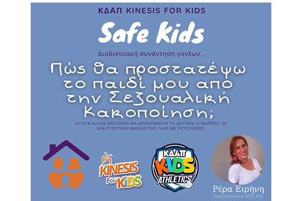 Το ΚΔΑΠ Kinesis for kids, λαμβάνοντας υπόψη όλα τα παραπάνω και τα συνεχώς αυξανόμενα ποσοστά σεξουαλικής κακοποίησης παιδιών και την ανησυχία τόσο των γονέων όσο και των εκπαιδευτικών για το τρόπο που μπορούν να λειτουργήσουν ως ένα προστατευτικό δίχτυ για αυτά, έλαβε την πρωτοβουλία οργάνωσης αυτή την σχετική διαδικτυακή συνάντηση, η οποία μάλιστα ολοκληρώθηκε με επιτυχία το χθεσινό απόγευμα. Η ομολογουμένως μεγάλη συμμετοχή των γονέων και το ιδιαίτερο ενδιαφέρον που επέδειξαν, αντικατοπτρίζει την αναγκαιότητα διοργάνωσης αντίστοιχων ενημερωτικών συναντήσεων, τις οποίες δεσμευόμαστε πως θα προγραμματίσουμε στο μέλλον. Αρωγός μας, στη προσπάθεια ενημέρωσης αναφορικά με τη προστασία των παιδιών από τη σεξουαλική κακοποίηση, στάθηκε η κ. Ρέρα Ειρήνη, διακεκριμένη ψυχολόγος με ειδίκευση στην παιδοψυχολογία και την αθλητική ψυχολογία, καθώς και πολυετή εμπειρία στο χώρο.