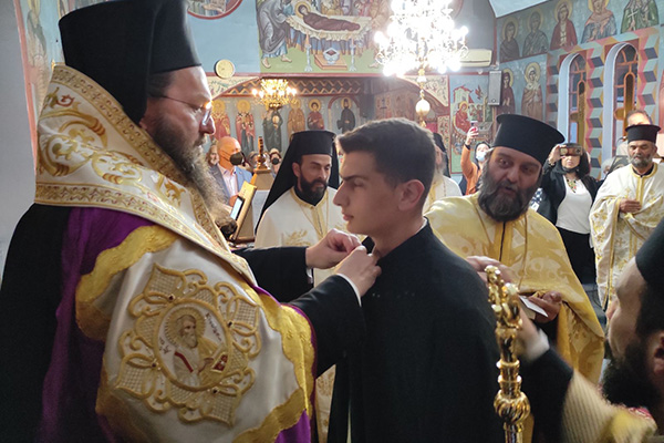Κατά την διάρκεια του Πανηγυρικού Εσπερινού και πριν την περιφορά της Ιεράς Εικόνος και του Ιερού Λειψάνου του Αγίου, ο Σεβασμιώτατος κ. Βαρθολομαίος προχείρησε έναν ευσεβή νέο μαθητή β' τάξεως λυκείου, στην τάξη των Αναγνωστών της Ιεράς Μητροπόλεως.