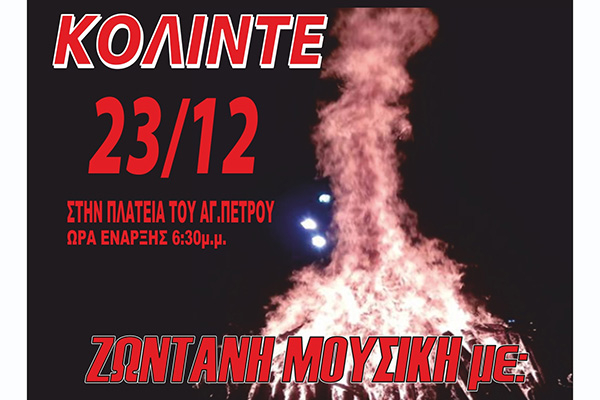 Στο χωριό του Αγίου Πέτρου Παιονίας (Κιλκίς), στην καρδιά της Μακεδονίας, αναβιώνει και φέτος το πανάρχαιο έθιμο «ΚΟΛΙΝΤΕ». Ζεστό κρασί, νηστήσιμα εδέσματα, παραδοσιακή φασολάδα και μουσική θα συντροφέψουν όλους εμάς που θα ζεσταθούμε γύρω από τη μεγάλη φωτιά που θα ανάψει στις 18:30 στην κεντρική πλατεία του χωριού την 23η Δεκεμβρίου.