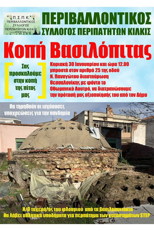 Σας προσκαλούμε στην κοπή της βασιλόπιτάς μας, την Κυριακή 30 Ιανουαρίου και ώρα 12.00, μπροστά στον αριθμό 25 της οδού Ν. Παναγιώτου, διασταύρωση Θεσσαλονίκης, με φόντο το Οθωμανικό Λουτρό, για να διατρανώσουμε την πρότασή μας για αξιοποίησή του από τον Δήμο Κιλκίς.