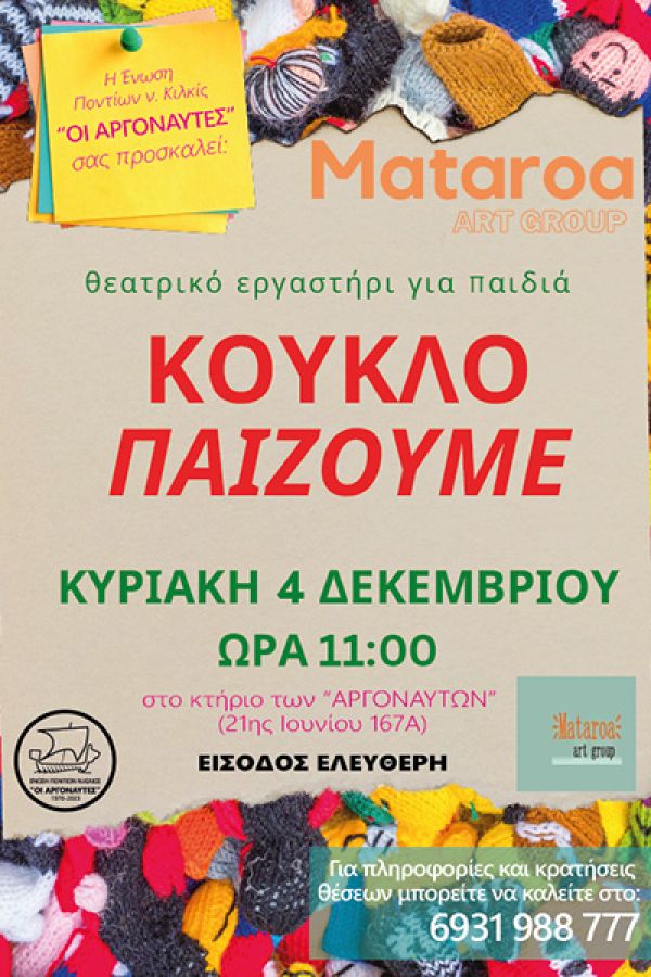 Είμαστε στην πολύ ευχάριστη θέση να προσκαλούμε τους μικρούς "ΑΡΓΟΝΑΥΤΕΣ" και τους φίλους τους, την Κυριακή 4 Δεκεμβρίου και ώρα 11:00, στην δράση "ΚΟΥΚΛΟ-ΠΑΙΖΟΥΜΕ" την οποία συντονίζουν οι εμψυχώτριες και δασκάλες θεάτρου Ελίνα Καλαϊτζόγλου και Μαρία Κουτσοκώστα του εργαστηρίου Mataroa Group.