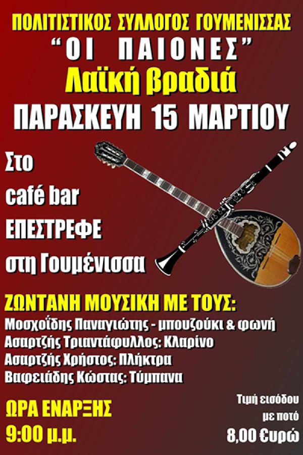 Ο Πολιτιστικός Σύλλογος Γουμένισσας ''Οι Παίονες", την Παρασκευή 15 Μαρτίου διοργανώνει λαϊκή βραδιά στο cafe-bar 'Επέστρεφε' στην Γουμένισσα.