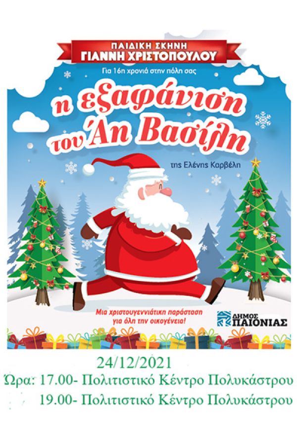 ΜΑΤΑΙΩΝΕΤΑΙ η σημερινή παράσταση στο Πολύκαστρο, "Η εξαφάνιση του Άη Βασίλη", με βάση την υπ' αριθμ. 6214/23-12-2021 (Β') ΚΥΑ. "Απαγορεύεται η διενέργεια δημοσίων ψυχαγωγικών εορταστικών εκδηλώσεων, καθώς και η διενέργεια οποιασδήποτε μορφής εκδηλώσεων, έναντι ανταλλάγματος, με φυσική παρουσία πλήθους, άνω των είκοσι (20) ατόμων σε ιδιωτικό, μη επαγγελματικό χώρο".