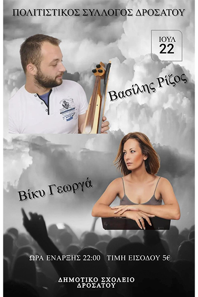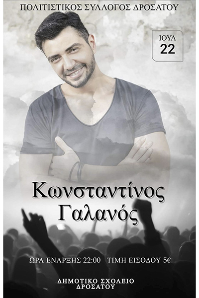 Ο Πολιτιστικός Σύλλογος Δροσάτου σας προσκαλεί στον μεγάλο ετήσιο χορό του, που διοργανώνει στις 22 Ιουλίου και ώρα 22:00, στον προαύλιο χώρο του Δημοτικού Σχολείου Δροσάτου.