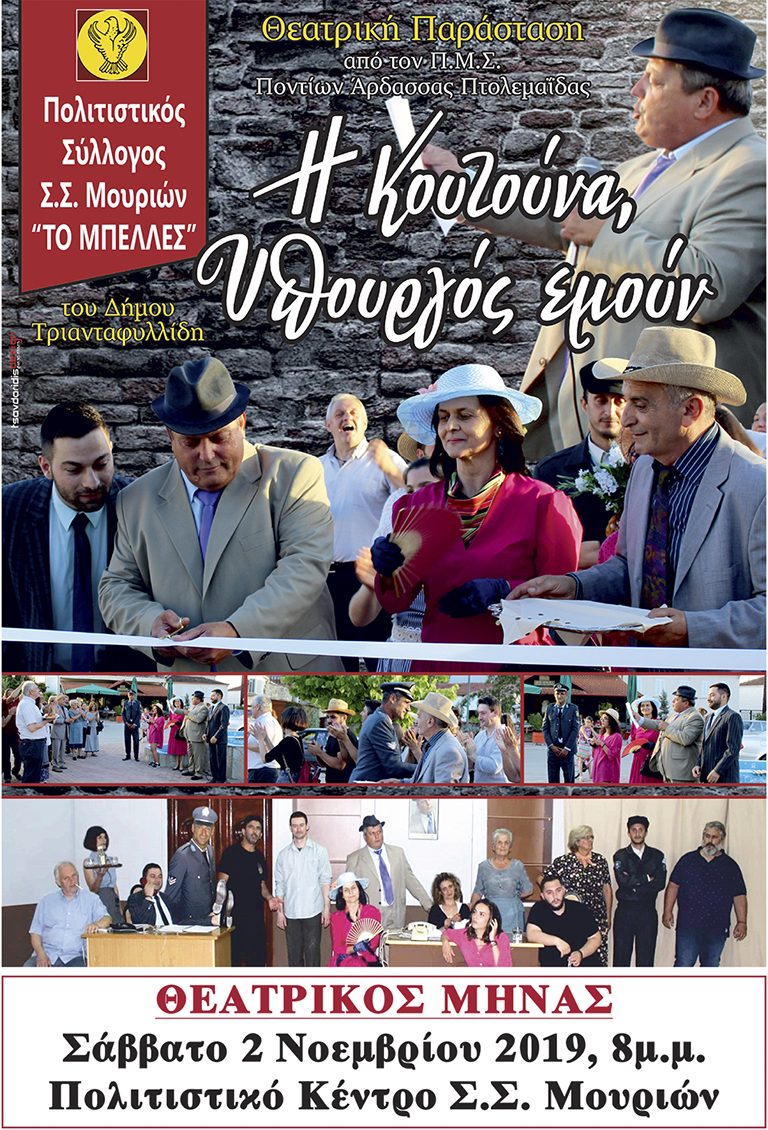 Η ποντιακή κωμωδία "Η Κουτούνα, υπουργός εμούν" του Δήμου Τριανταφυλλίδη ανοίγει, σήμερα Σάββατο 2 Νοεμβρίου, την αυλαία του Θεατρικού Μήνα, που οργανώνει ο Πολιτιστικός Σύλλογος Σ.Σ. Μουριών "Το Μπέλλες".