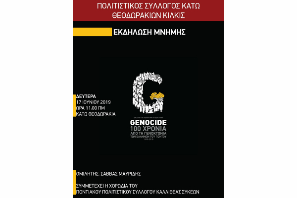 Η χορωδία του ΠΠΣΚ Συκεών Θεσσαλονίκης συμμετέχει, την Δευτέρα 17 Ιουνίου 2019, 11:00 πμ στα Κάτω Θεοδωράκια Κιλκίς, στην εκδήλωση μνήμης που διοργανώνει ο Σύλλογος Κάτω Θεοδωρακίων Κιλκίς, για τα 100χρόνια απο την Γενοκτονία του Ποντιακού Ελληνισμού. Ομιλητής στην εκδήλωση θα είναι ο καθηγητής Κοινωνιολογίας του ΑΤΕΙ Θ κ.Σάββας Μαυρίδης.