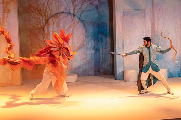 Ο πρίγκιπας Ταμίνο -σύμβολο της αρετής και της αγάπης, βρίσκει στο πρόσωπο της Παμίνας το ιδανικό ταίρι. Όμως το ζευγάρι θα περάσει από πολλές δοκιμασίες. Με όπλο την αγάπη, οι ήρωές μας θα νικήσουν και θα ενωθούν για πάντα. Μαζί τους ο Παπαγκένο, ένας χαριτωμένος παραμυθένιος ήρωας που με τις σκανδαλιές του θα χαρίσει στα παιδιά στιγμές χαράς και γέλιου. Το έργο τελειώνοντας βρίσκει τους δυο εχθρούς, βασίλισσα της νύχτας και βασιλιά της μέρας, ενωμένους. Το καλό θα νικήσει το κακό και θα απλωθεί σ’ όλη τη γη.