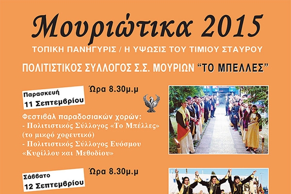 Ενα πλούσιο τετραήμερο εκδηλώσεων οργανώνει ο δραστήριος Πολιτιστικός Σύλλογος Σ.Σ. Μουριών "ΤΟ ΜΠΕΛΛΕΣ", από την Παρασκευή 11 Σεπτεμβρίου μέχρι τη Δευτέρα 14 Σεπτεμβρίου, με την ευκαιρία της τοπικής πανήγυρης.