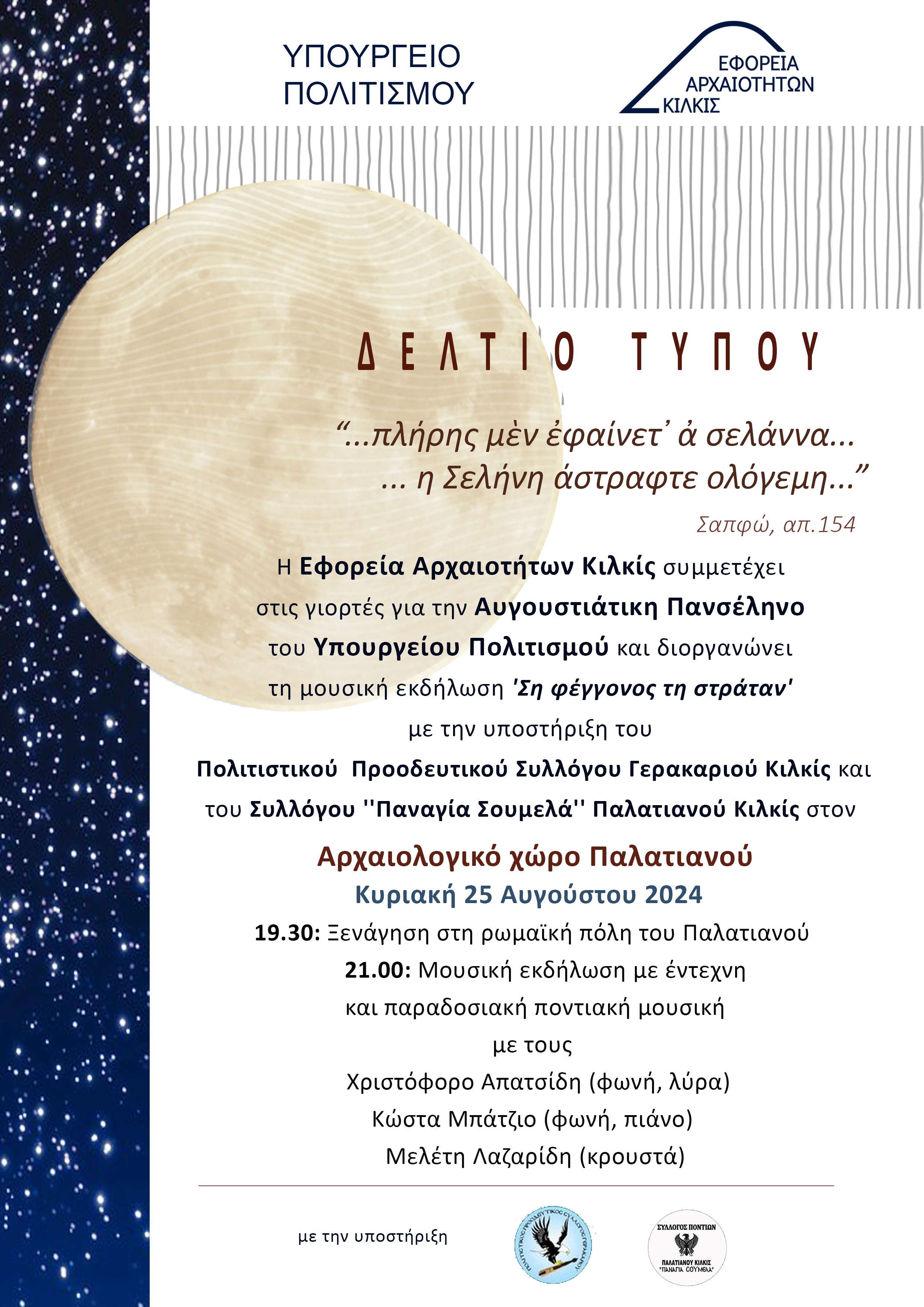 Η Εφορεία Αρχαιοτήτων Κιλκίς συμμετέχει και φέτος στη δράση του Υπουργείου Πολιτισμού για την Πανσέληνο του Αυγούστου την Κυριακή 25 Αυγούστου 2024 και ώρα 21.00, σε μουσική εκδήλωση για το φεγγάρι με έντεχνη και παραδοσιακή ποντιακή μουσική στον αρχαιολογικό χώρο Παλατιανού.