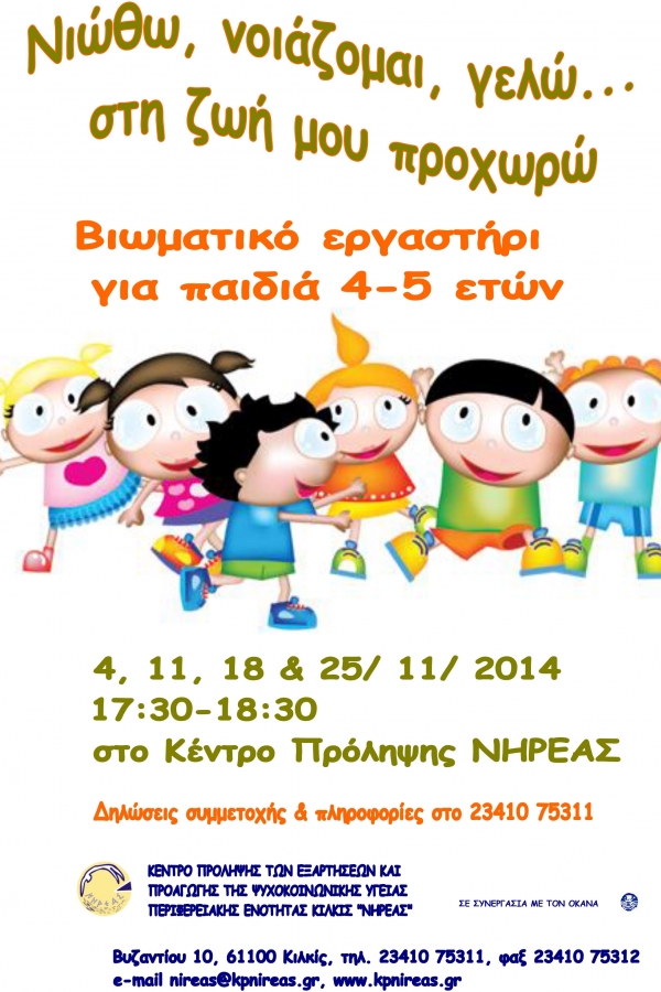 Το Κέντρο Πρόληψης των Εξαρτήσεων και Προαγωγής της Ψυχοκοινωνικής Υγείας Περιφερειακής Ενότητας Κιλκίς “ΝΗΡΕΑΣ” πρόκειται να υλοποιήσει βιωματικό εργαστήρι για παιδιά ηλικίας 4 - 5 χρονών (προνήπια και νήπια) με τίτλο Νιώθω, νοιάζομαι, γελώ… στη ζωή μου προχωρώ.