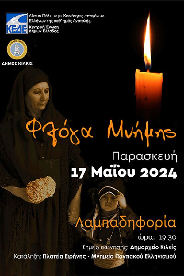 Ο Δήμος Κιλκίς προσκαλεί την Παρασκευή 17 Μαϊου όλους τους πολίτες, τους Ποντιακούς και Πολιτιστικούς Συλλόγους, τους Κοινωνικούς, Εκπαιδευτικούς και Αθλητικούς Φορείς να κρατήσουν άσβεστη τη Φλόγα της Μνήμης και να αποτίσουν με την παρουσία τους τον οφειλόμενο φόρο τιμής στα 353.000 θύματα της Γενοκτονίας των Ελλήνων του Πόντου