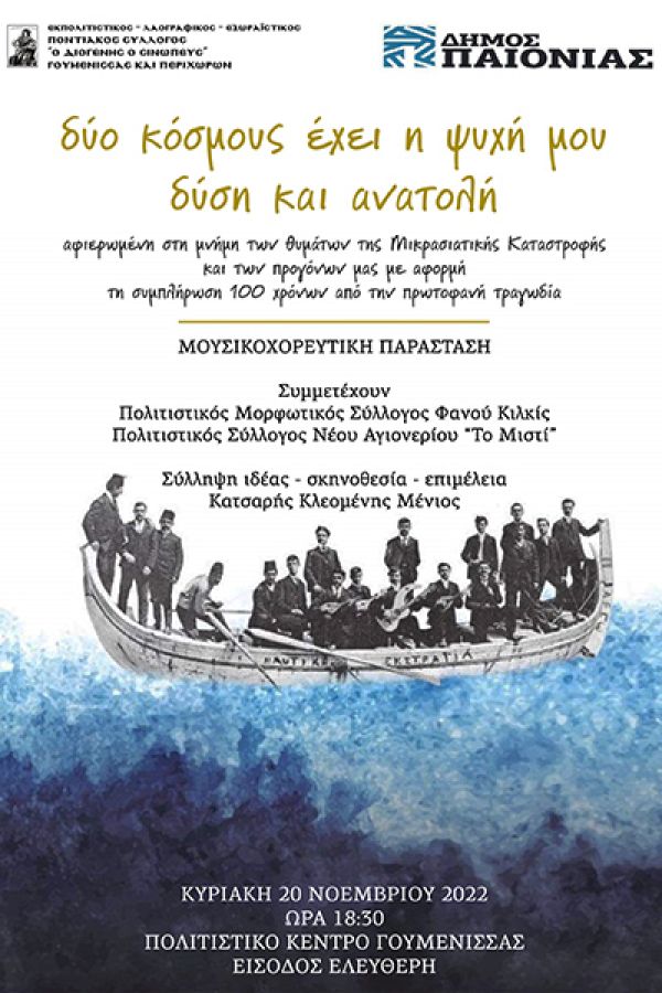 Ο Ποντιακός Σύλλογος Γουμένισσας "Ο Διογένης ο Σινωπεύς" σας προσκαλεί στη μουσικοχορευτική παράσταση με τίτλο: "Δύο κόσμους έχει η ψυχή μου, δύση και ανατολή", που θα πραγματοποιηθεί την Κυριακή 20 Νοεμβρίου 2022 και ώρα 18.30, στο Πολιτιστικό Κέντρο Γουμένισσας, με τη στήριξη του Δήμου Παιονίας.