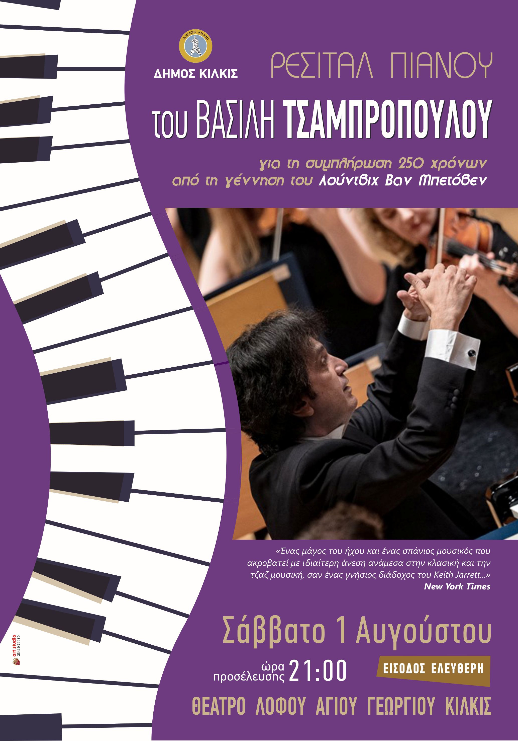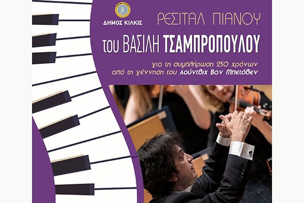 Το ρεσιτάλ πιάνου του Βασίλη Τσαμπρόπουλου - αφιέρωμα στα διακόσια πενήντα χρόνια από τη γέννηση του Μπετόβεν είναι ενταγμένο στο Πολιτιστικό Καλοκαίρι του Δήμου Κιλκίς. Η εκδήλωση αρχίζει στις 21:00 με ελεύθερη είσοδο για το κοινό.