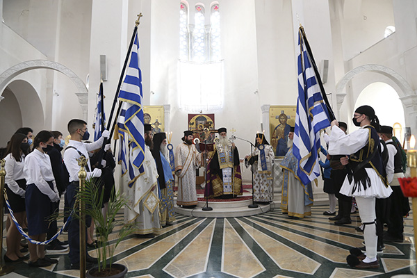 Η ημέρα της πρώτης μεγάλης εθνικής μας εορτής επικαιροποίησε πάλι τους επετειακούς εορτασμούς για τα 200 χρόνια από την Επανάσταση του 1821. Παρελεύνοντες ελεύθερα στη χιλιοβασανισμένη γη των αγίων και των νεομαρτύρων και των ηρώων προγόνων μας, συναντηθήκαμε νοερά με τους ομογενείς αδελφούς μας όπου γης και προπαντός με τα θύματα του λυσσώδους πολέμου στην Ουκρανία. Οι λειτουργικές μας δεήσεις απευθυνθήθηκαν εναγώνιες για όλους τους αδελφούς μας “εν γη, εν θαλάσση, δεομένους της φιλανθρωπίας του Θεού” και παρακαλούσαμε τον Κύριο “πάσι χορήγησον το μέγα σου έλεος”. Η θεία Λειτουργία ασφαλώς όλων των Ορθοδόξων ανά την οικουμένη ήταν συναρμοσμένη και με καρδιακές ικεσίες και πάλιν ικεσίες “προς τον μόνον δυνάμενον σώσαι”. Αυτό συνέβη και σε όλες τις ενορίες της Μητροπόλεώς μας.