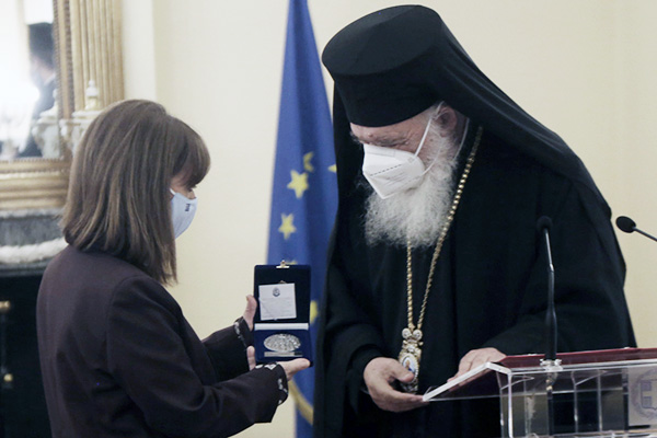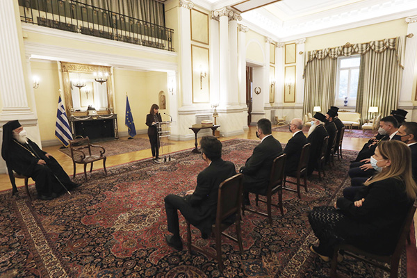 Μετά την παραλαβή των τόμων και του Μεταλλίου η ΠτΔ κ. Κατερίνα Σακελλαροπούλου, αφού ευχαρίστησε θερμά, αλλά και συνεχάρη για αυτήν την ιδιαίτερα αξιοθαύμαστη πρωτοβουλία, τόνισε: «Για την υλοποίηση αυτής της προσπάθειας συγκεντρώσατε, Μακαριώτατε, ερευνητές, πανεπιστημιακούς δασκάλους, συγγραφείς ανοιχτούς στον διάλογο, αφού μόνον αυτός προάγει την επιστήμη και τον στοχασμό, αποτελώντας κινητήρια δύναμη για την εξέλιξή τους. Στους δέκα αυτούς Τόμους διαγράφεται η διανοητική διεργασία, μέσω της οποίας οι εισηγητές αναπαρέστησαν τον τρόπο με τον οποίο ενεργούσαν και σκέφτονταν οι άνθρωποι της εποχής την οποία εξετάζουν, καθώς και τον τρόπο σκέψης των λίγων που δημιούργησαν τις πηγές στις οποίες ανατρέχουν. Αναδεικνύεται ο διαρκής έλεγχος, στον οποίο οι συντάκτες υπέβαλαν το παρελθόν, θέτοντας ανανεωμένα και εμπλουτισμένα ερωτήματα που μας επιτρέπουν να κατανοήσουμε τις δυνάμεις οι οποίες κατέστησαν τον τόπο και την κοινωνία μας αυτό που είναι σήμερα. Κυρίως όμως το πόνημα διαπνέεται από νηφαλιότητα και αίσθημα ευθύνης απέναντι στον παιδευτικό ρόλο που διαδραμάτισε ιστορικά η Εκκλησία μας και τον οποίο συνεχίζει να διαδραματίζει».