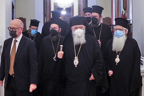 Ο Αρχιεπίσκοπος συνοδευόταν από τον πρόεδρο της Ειδικής Συνοδικής Επιτροπής Πολιτιστικής Ταυτότητος, Μητροπολίτη Δημητριάδος και Αλμυρού κ. Ιγνάτιο, τον μέχρι πρότινος Γραμματέα της Επιτροπής, Μητροπολίτη Κιλκισίου κ. Βαρθολομαίο, τον Αρχιγραμματέα της Ιεράς Συνόδου της Εκκλησίας της Ελλάδος, Επίσκοπο Ωρεών κ. Φιλόθεο, τον Γραμματέα της Επιτροπής Αρχιμανδρίτη Δαμασκηνό Πετράκο, τον πρόεδρο της Ειδικής Συνοδικής Επιτροπής επί της Ακαδημίας Εκκλησιαστικών Τεχνών, Πρωτοπρεσβύτερο Θωμά Συνοδινό και τον Γραμματέα της Επιτροπής Αρχιμανδρίτη Αθηναγόρα Σουπουρτζή, ενώ στην τελετή παρέστησαν συνεργάτες της ΠτΔ.