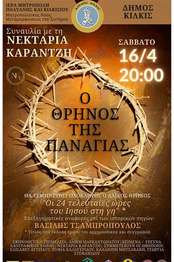 Ο Δήμος Κιλκίς προσκαλεί την Νεκταρία Καραντζή στην κορυφαία στιγμή του Θείου Πάθους. Οι τελευταίες 24 ώρες του Χριστού πάνω στη γη, ο σπαρακτικός θρήνος της Παναγιάς θα αποδοθούν a cappella από την κορυφαία υμνωδό σε μια κατανυκτική συναυλία που θα δοθεί το Σάββατο 16 Απριλίου στον Ιερό Μητροπολιτικό Ναό Μεταμορφώσεως του Σωτήρος με ώρα έναρξης στις 20:00.