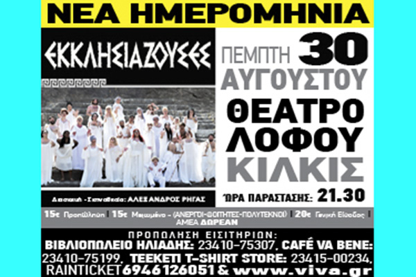 Η παράσταση "Εκκλησιάζουσες", σε διασκευή Αλέξανδρου Ρήγα, θα παρουσιαστεί σε νέα ημερομηνία, την Πέμπτη 30 Αυγούστου στο Θέατρο Λόφου Κιλκίς, στις 9:30 το βράδυ.