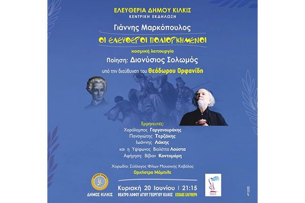 Οι ‘’Ελεύθεροι Πολιορκημένοι’’, ορόσημο της 108ης επετείου της ιστορικής μάχης του Κιλκίς αλλά και του εορτασμού των 200χρόνων από την έναρξη της Ελληνικής Επανάστασης, με τον ποιητικό λόγο του εθνικού μας ποιητή, εντοιχισμένο στο μουσικό έργο του Γιάννη Μαρκόπουλου, εξιστορούν τον δραματικό αγώνα των υπερασπιστών του Μεσολογγίου, κατά τη δεύτερη πολιορκία του από τους Οθωμανούς, που κράτησε σχεδόν ένα χρόνο (1825-1826) και κορυφώθηκε με την απέλπιδα έξοδο της Κυριακής των Βαΐων στις 10 Απριλίου 1826. Καταθέτουν ως μαρτυρία το ηθικό μεγαλείο των Ελλήνων αγωνιστών που αντιστέκονται στους πειρασμούς και οδηγούνται με πλήρη συνείδηση στη θυσία για την κατάκτηση της πνευματικής ελευθερίας τους.